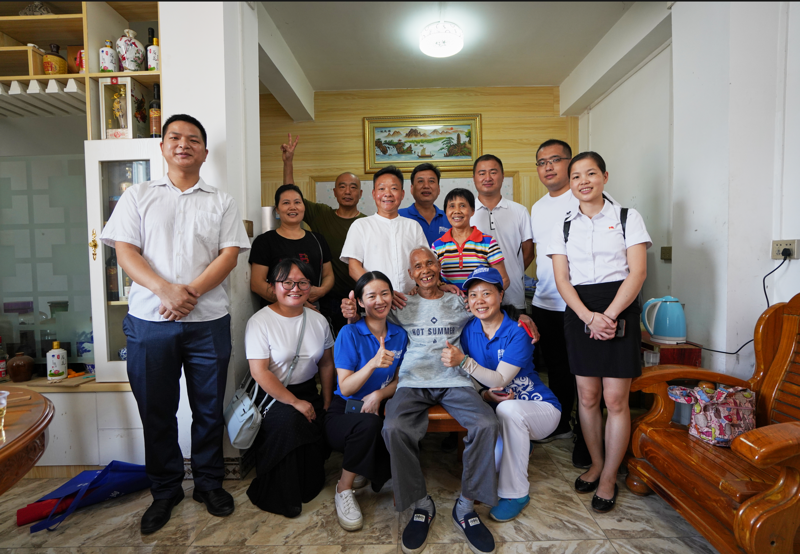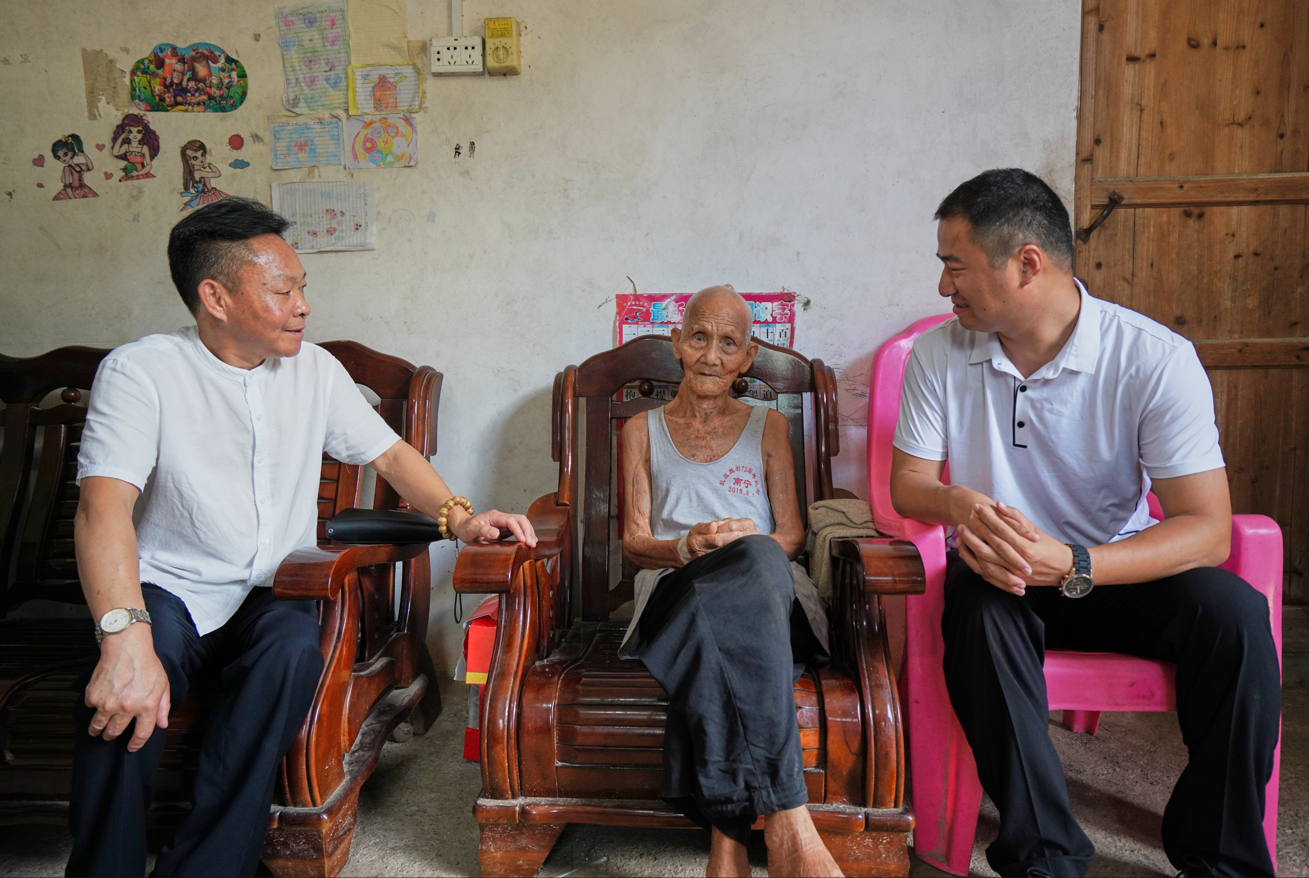 在抗战老兵的家中,集团总裁杨罗生先生、广西公司总经理张正海先生与抗战老兵陶盛万促膝交谈,询问抗战老兵的身体状况和生活情况,共忆难忘的抗战经历。