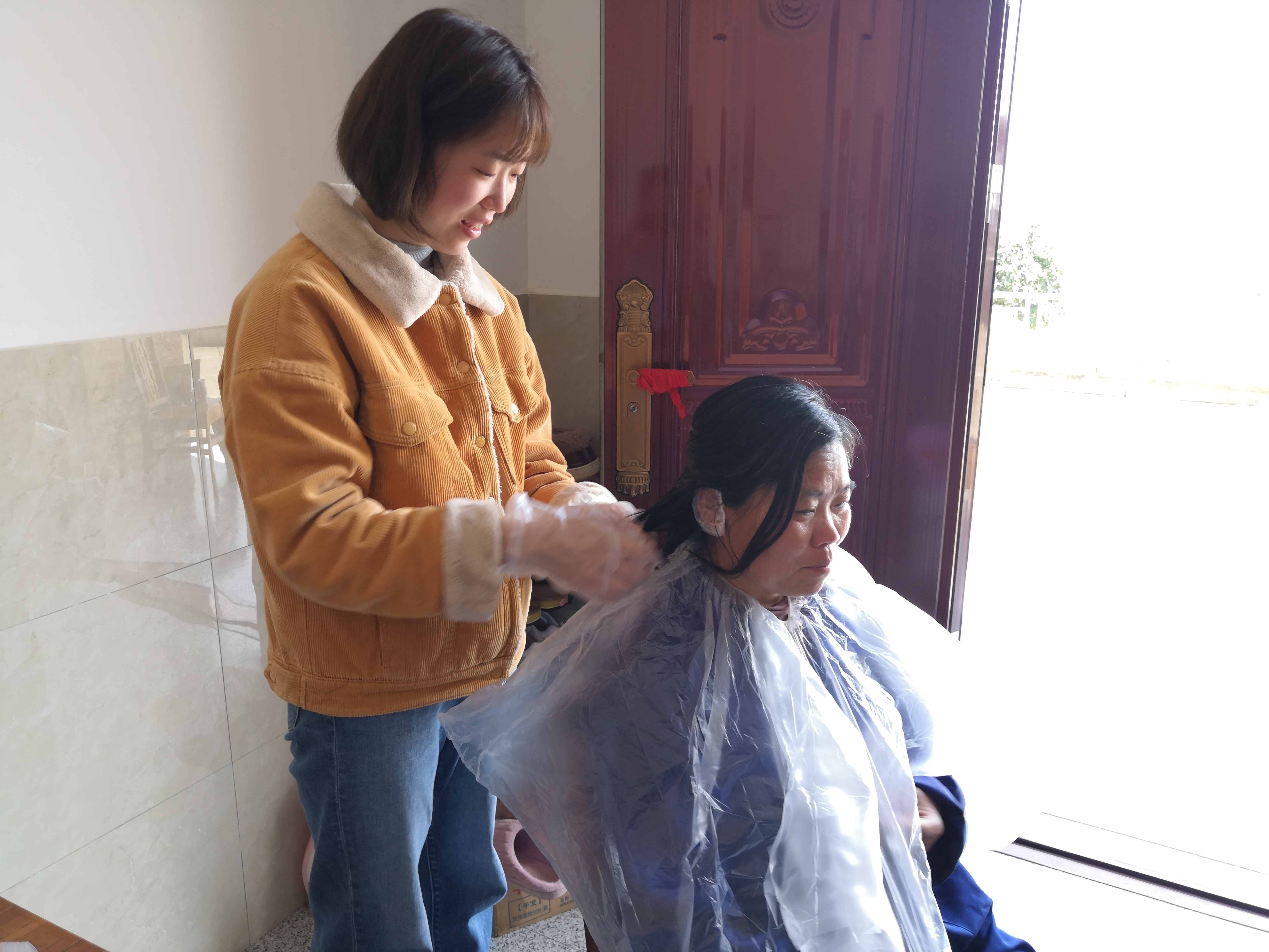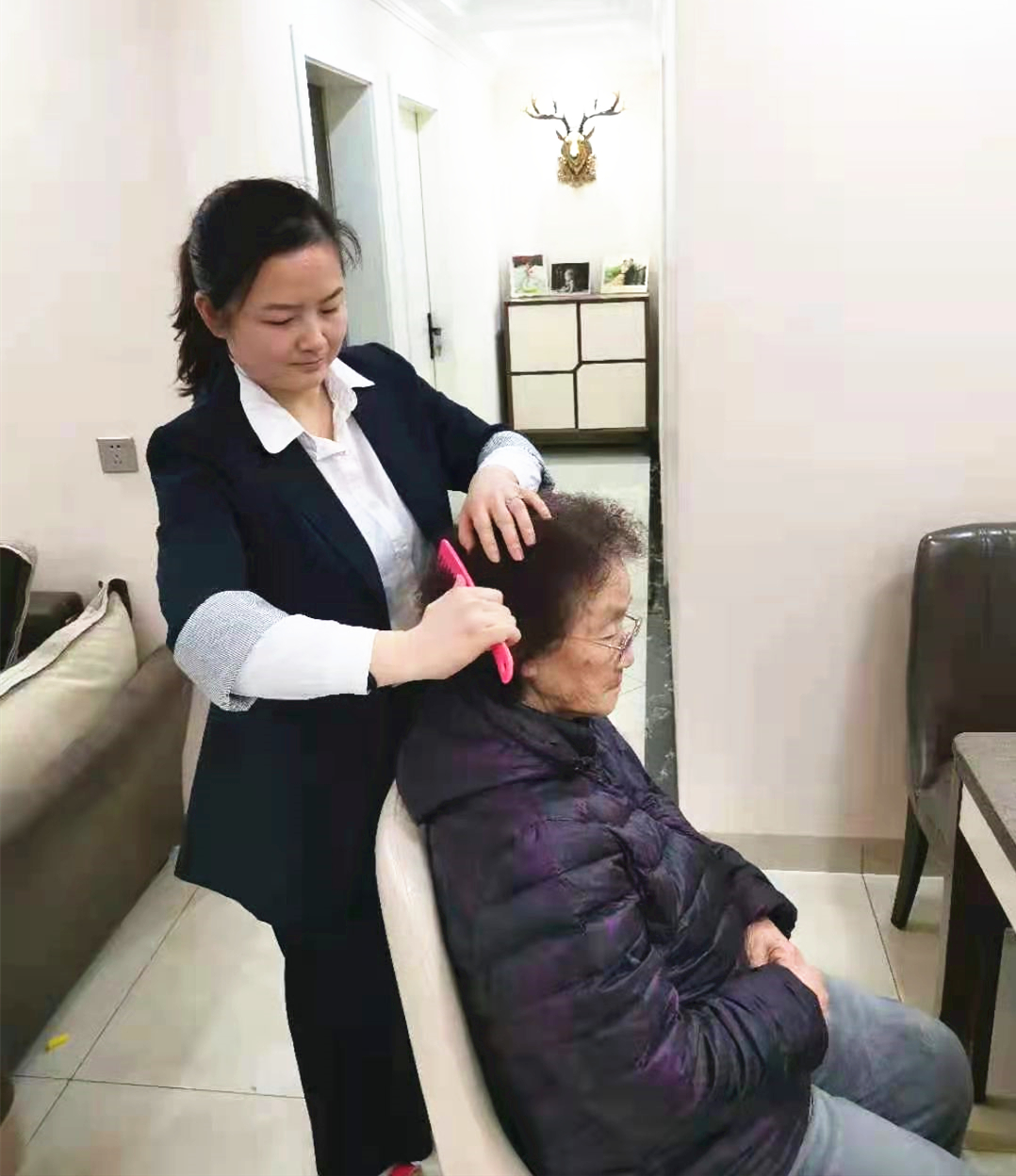 外婆八十六岁了,过年前我刚带她去烫染了头发,一会要出去逛街,我给外婆梳梳头。