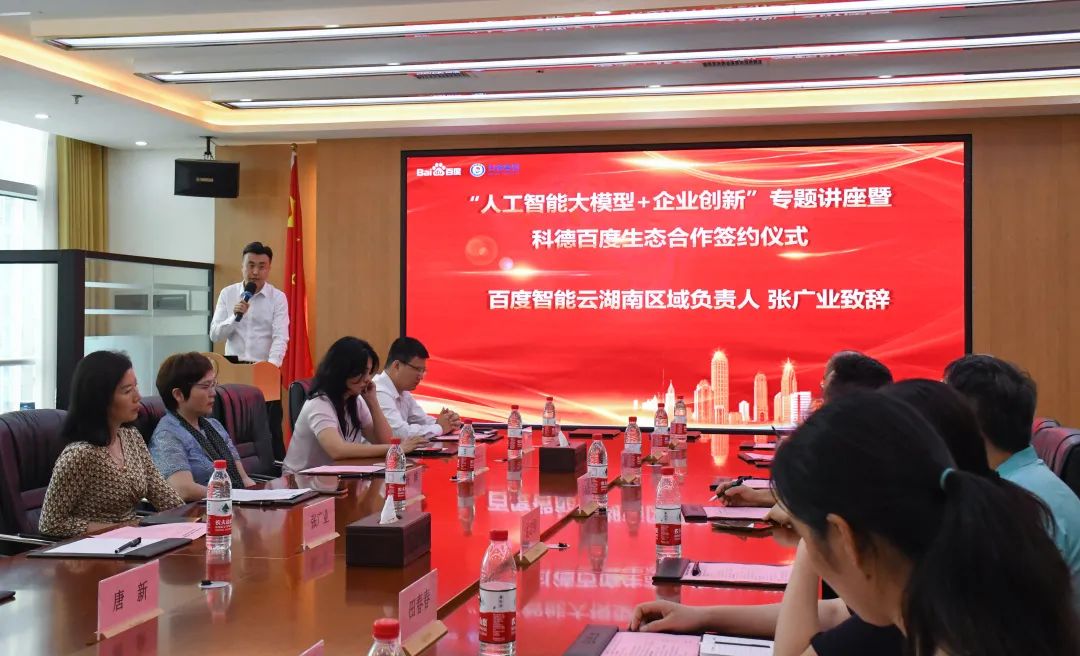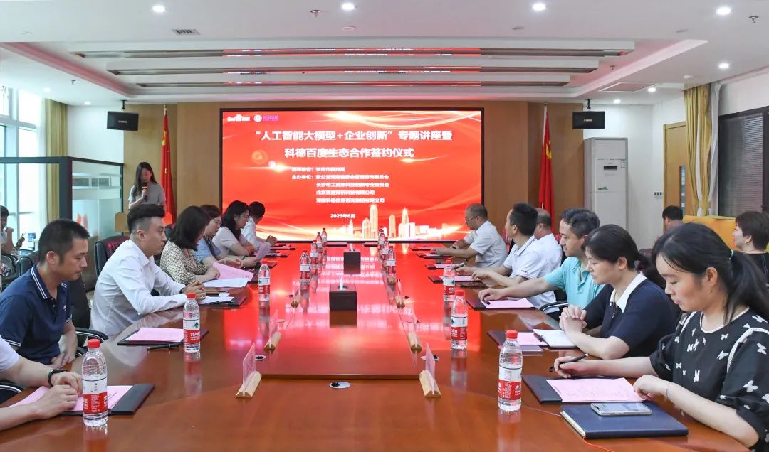 6月16日下午, “人工智能大模型+企业创新”专题讲座暨科德百度生态合作签约仪式在科德集团总部隆重举行。此次活动由长沙市科技局指导、致公党湖南省委会管理咨询委员会、长沙市工商联科技创新专业委员会、北京百度网讯科技有限公司(简称“百度网讯”)及湖南科德信息咨询集团有限公司(简称“科德集团 ”) 联合主办。长沙市科技局党组成员、副局长杨婵、长沙市人大常委会委员、市工商联副主席田桂元出席并见证了此次签约仪式。致公党湖南省委管理咨询委员会副主任王畅、粟鑫,长沙轨道集团、长房集团、华自科技、泰嘉股份等20余家大中型企业负责人参加了此次专题讲座。