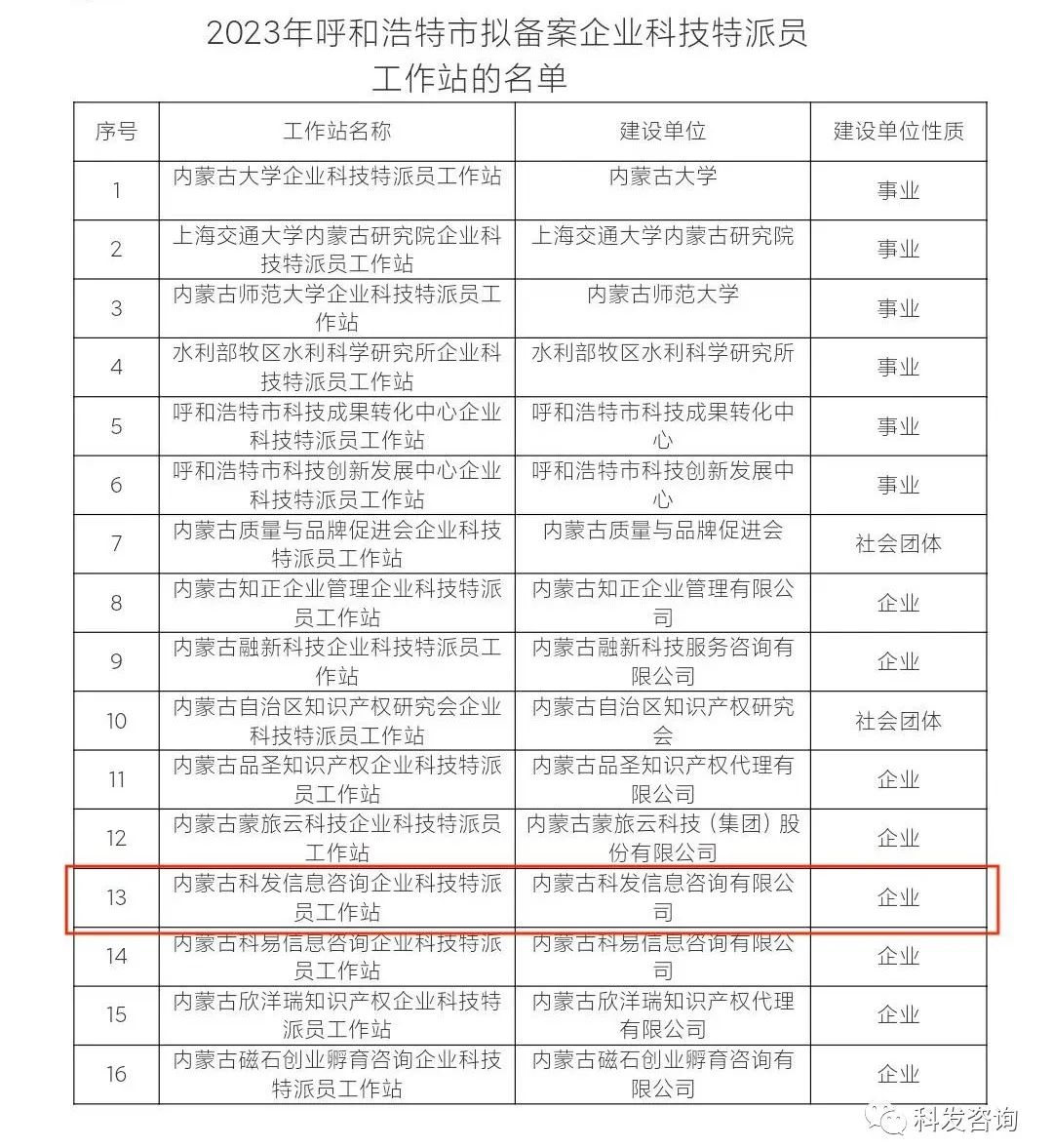 近日,呼和浩特市科学技术局根据《内蒙古自治区企业科技特派员管理办法》、《内蒙古自治区科学技术厅关于印发<2023年企业科技特派员工作实施方案>的通知》(内科高字〔2023〕32号)和《呼和浩特市科学技术局关于组织开展企业科技特派员工作站备案工作的通知》(呼科字〔2023〕464号),经各旗县区科技管理部门推荐、专家评审、现场考察 等程序,内蒙古科发信息咨询有限公司被评选为呼和浩特市企业科技特派员工作站。